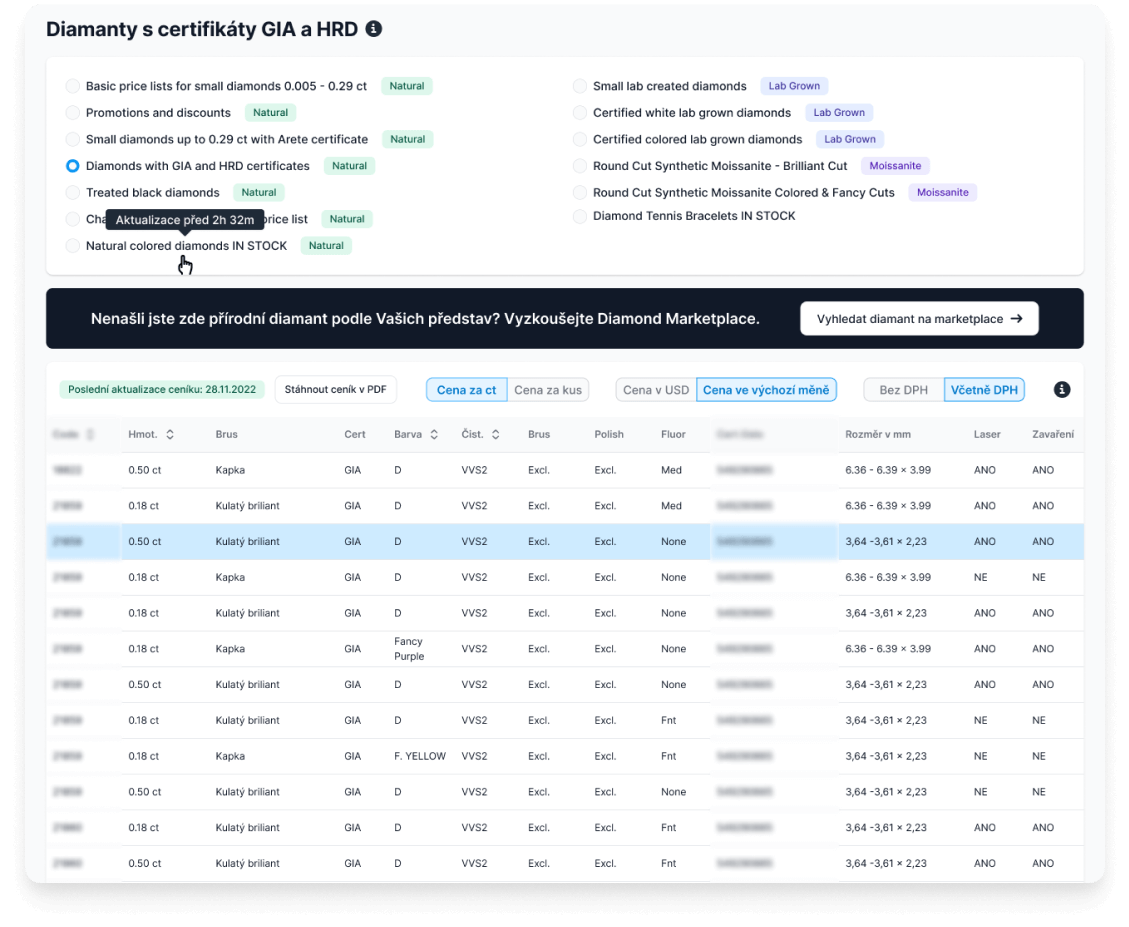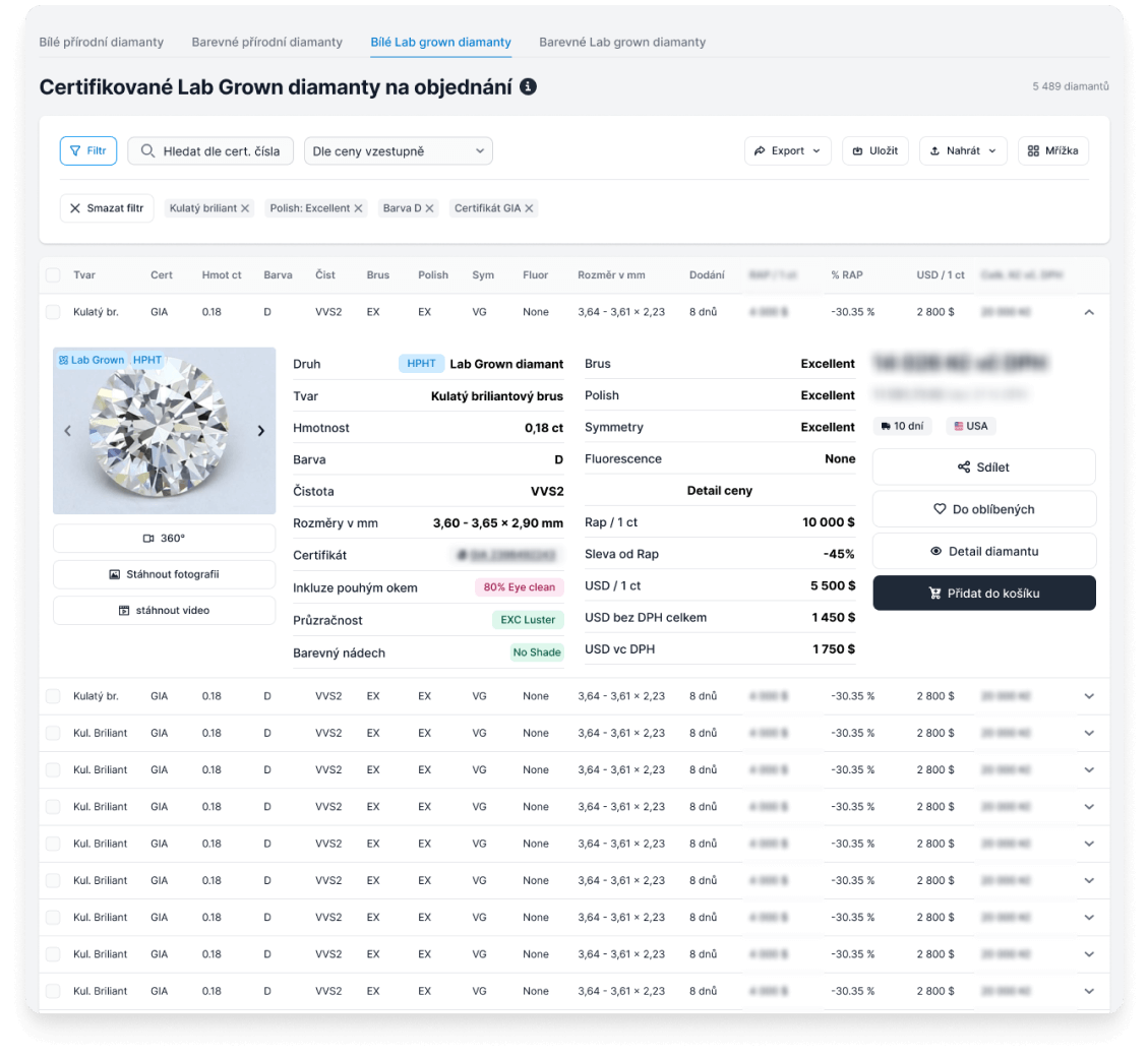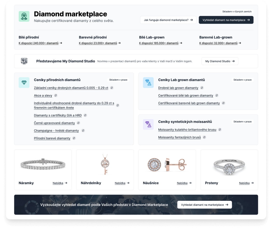 Registrovaní používatelia majú prístup k cenám drobných diamantov, certifikovaných diamantov a môžu objednávať certifikované prírodné aj laboratórne diamanty z celého sveta na našom Marketplace.